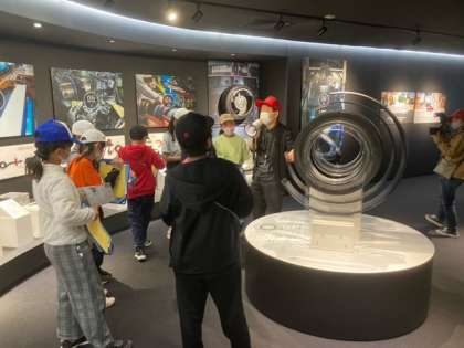 クラスを2つに分けて、見学や体験をしています。タイヤの秘密をたくさん知ります。
