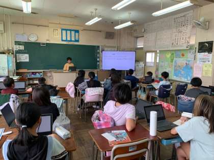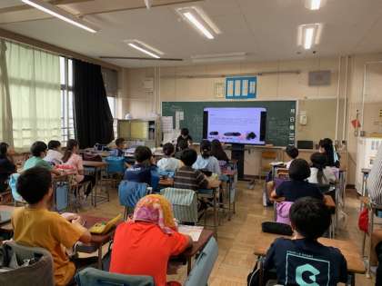 写真は事前学習の発表会の様子と係活動の打ち合わせの様子です。