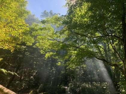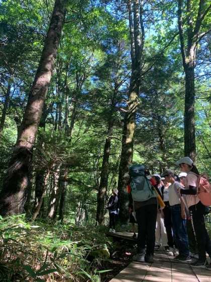 ミズナラとカラマツ、シラカバを中心とした森をハイキングしています。