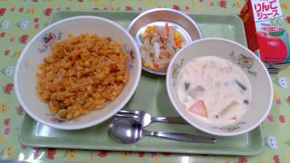 ☆今日の献立 大豆ピラフ クリームシチュー ツナと野菜のサラダ りんごジュース