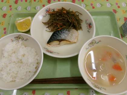 ☆今日の献立 ごはん 鯖の塩焼き 呉汁 茎わかめのきんぴら 湘南ゴールド 牛乳