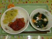 ☆今日の献立かつめし青菜と豆腐のすまし汁みかん牛乳