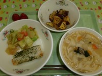 ☆今日の献立山梨ほうとうちくわの磯辺焼き野菜の香り和え大学芋いちご牛乳