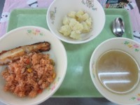 今日の献立・大豆ピラフ・タンドリーフィッシュ・ポテトカルボナーラ・オニオンスープ...