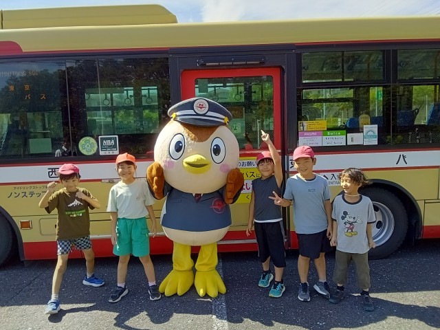 今日は西東京バスのバスの乗り方教室に行きました。バスで迎えに来てもらって、恩方営業所へ行き、バスに乗ったままバスの洗車の様子を体験しました。その後、少し移動してバスの乗り方を教えてもらいました。今日は特別に新車のバスの運転席に1人ずつ乗せてもらい、去年は会えなかったにしちゅんにも会えました。みんなもいろいろな質問をしていたので、きっとバスの博士になったことでしょう。
