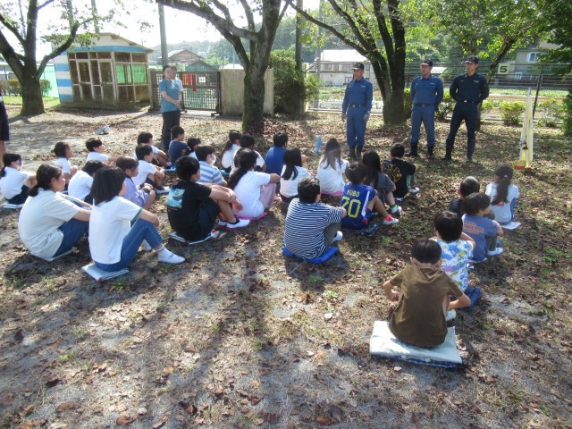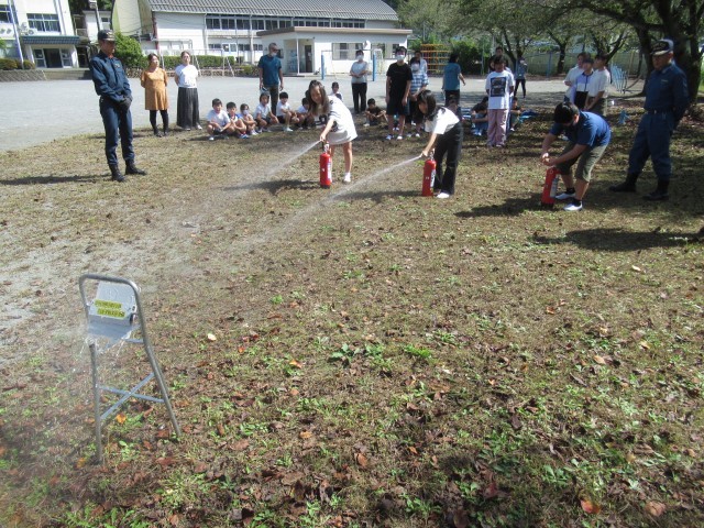 本日3校時、火災を想定した初期消火訓練を行いました。みんな速やかに校庭へ避難し、避難後は、楢原出張所から来てくださった消防隊員の方から、消火器の使い方などを教えていただきました。6年生が代表して消火訓練を体験しました。