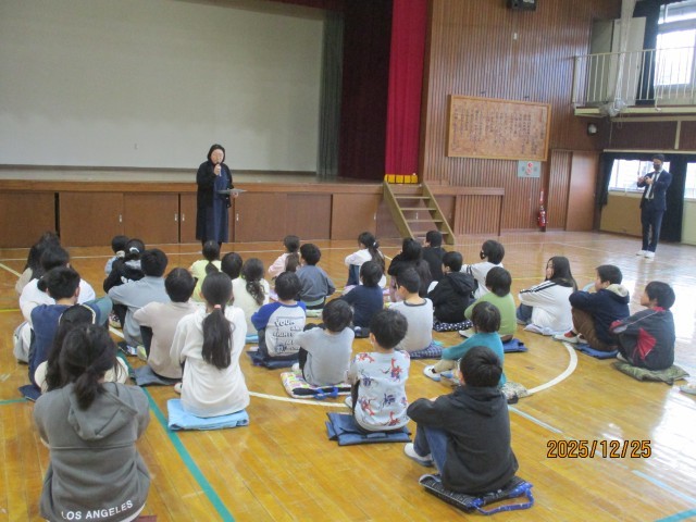 生活指導から、「冬休みを安全に、楽しく過ごすために」の話がありました。冬休みを安全に楽しく過ごして3学期の始業式に元気いっぱい登校してくれることを心待ちいしています。