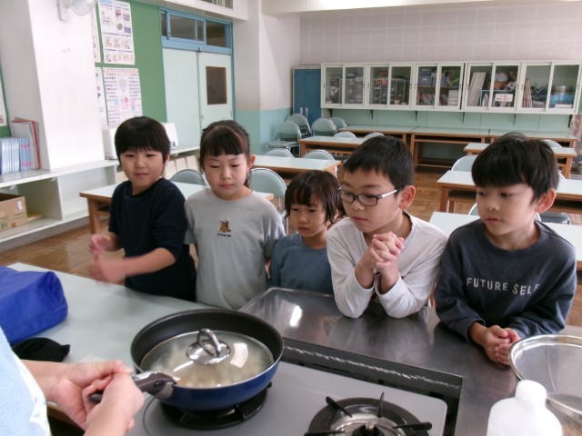 12月19日金曜日に生活科で種から育てたイエローポップをフライパンでポップコーンにして食べました。