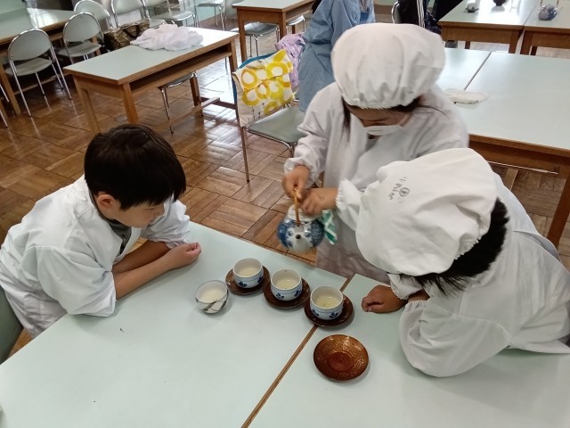 みんなで協力して急須や湯飲みを準備して、お茶を計って上手に淹れていました。