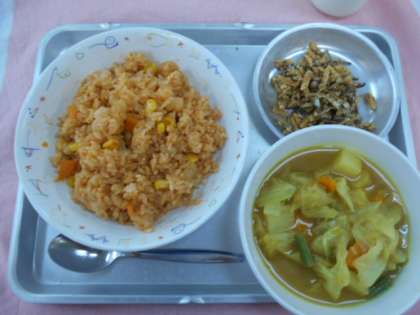 大豆ご飯 野菜のカレースープ煮 手作りさかなナッツ 牛乳