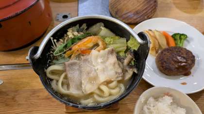 一人用のいろり鍋はフタがしてあり、最初は中身が分かりませんでした。しかし、「いただきます」をする頃には火も消えて、食べ頃になったので、再びその生徒のところに行って、写真を撮りました。(○○さん、ご協力に感謝します!)
