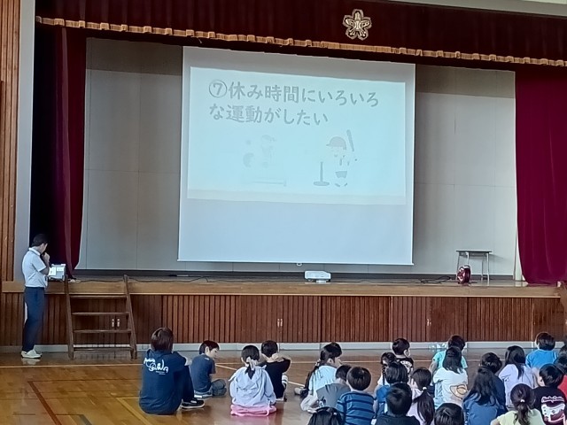 今朝の全校朝会は、以前体力向上のアイデアを子どもたちから集めた結果の報告を行いました。副校長先生から子どもたちから寄せられたアイデア上位7つが発表されると、聞いている子どもたちの目もどんどん輝きを増していきます。みんなで遊びたい!休み時間が長かったらいい!中には朝登校したら校庭10周、なんていう過激なものもありましたか、なかなか人気を集めていました。全校の反応がわかったところで、このあと体育委員会でも検討していきます。自分たちの願いが実現する、そんな経験がとっても大切です。