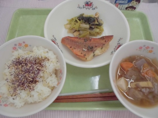 19日 いろどりごはん 赤魚の薬味焼き けんちん汁 小松菜と油揚げの炒め煮 牛乳