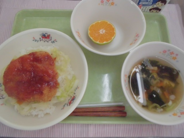 25日 かつめし 青菜と豆腐のすまし汁 果物(みかん) 牛乳