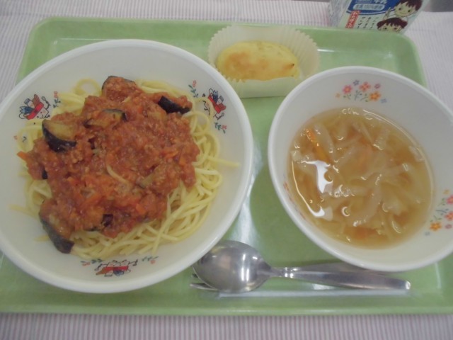 26日 秋ナスのスパゲティミートソース キャベツとベーコンのスープ スイートポテト 牛乳