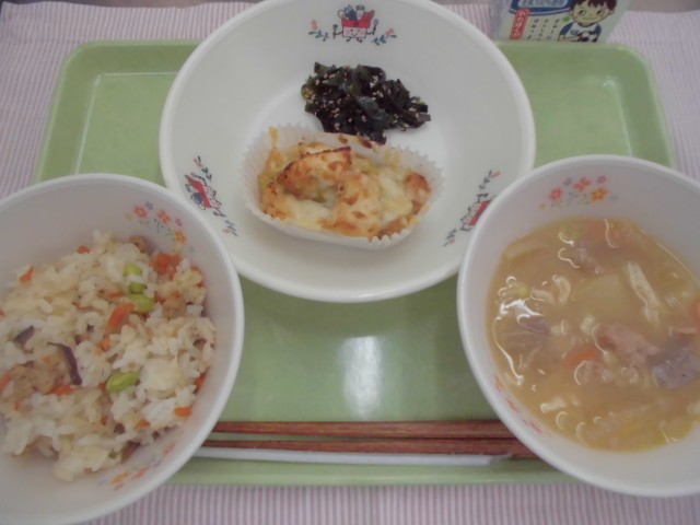 30日 五目おこわ 厚揚げのチーズ田楽 わかめのにんにく炒め 豚汁 牛乳