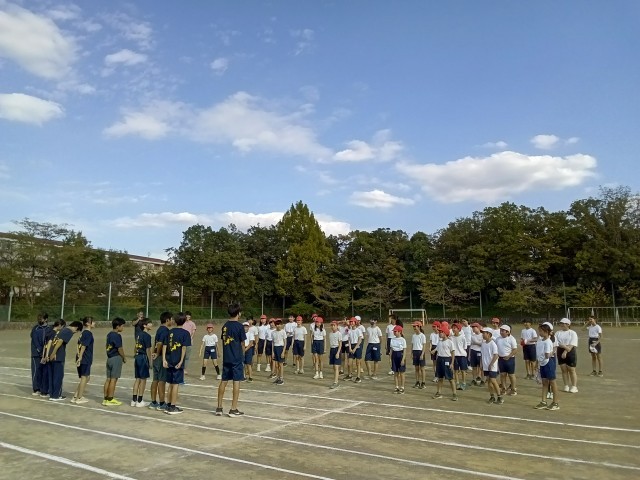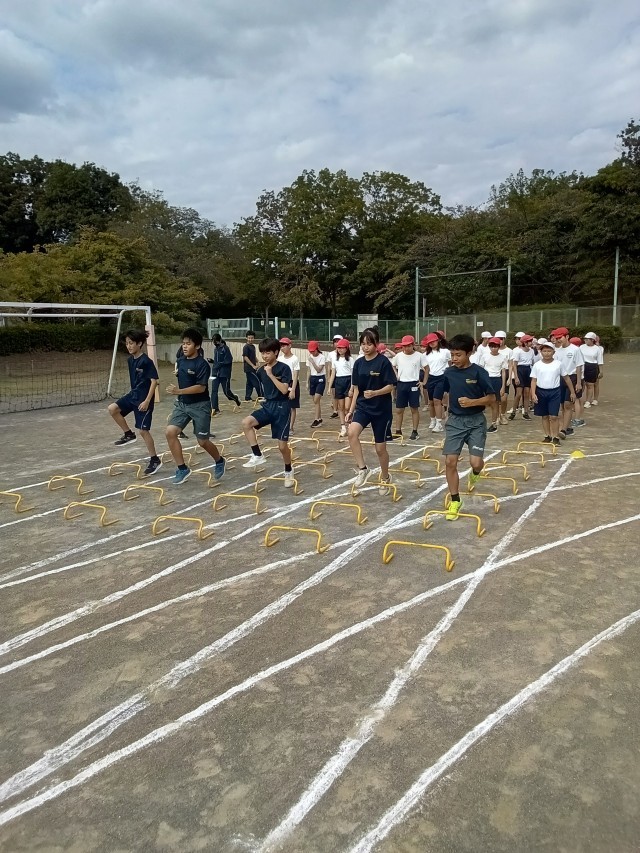 運動会まで一月を切りました。ようやく秋の空が広がったこの日、5年生と6年生は南大沢中学校の陸上部の皆さんに短距離走の走り方を教えていただきました。陸上部のメンバーには卒業生も混じっていて、子どもたちはすぐに先輩方に馴染むことができました。着地、足首、膝、股関節それぞれの動きを意識できるようなドリルを練習したあとは、50m走に挑戦しました。みんな体の動きがシャープになって、かっこよかったよ。