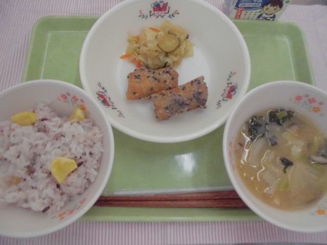 秋月ごはん・・・黒米を入れて色づけしたごはんに、甘く煮た栗が入ったごはんです。秋の夜空に浮かぶ美しい月を黒米と栗で表現しました。