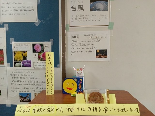 日本語学級よ教室壁面には、日本や諸外国の文化や風習に関わる展示をしています。日本語の習得もコミュニケーション能力の伸長も、究極的には多文化共生社会の実現のために役立つ力です。みんなが関心を持てるよう工夫しています。お月見の季節、在籍児童の保護者の方が、月餅を提供してくださいました!
