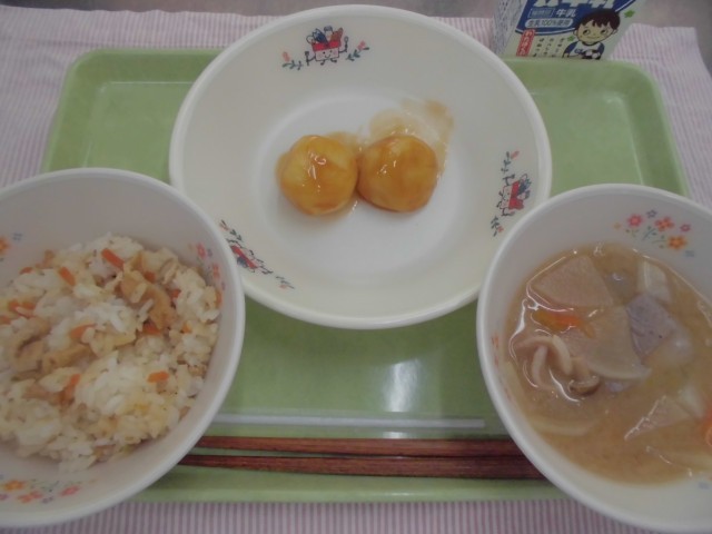 6日 こぎつねごはん 芋の子汁 お月さまだんご 牛乳