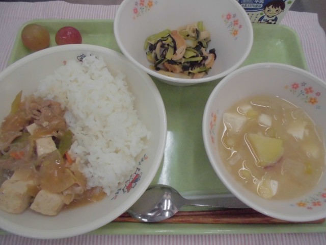 9日 ごはん すき焼き風煮物 さつま汁 小松菜と油揚げの煮びたし 果物 牛乳