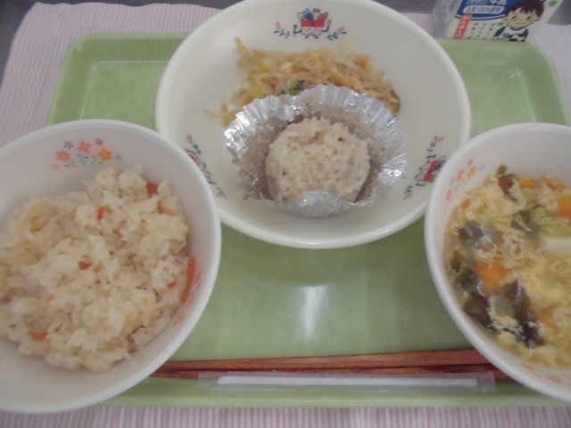 10日 人参ごはん いが蒸し かきたま汁 じゃこサラダ 牛乳
