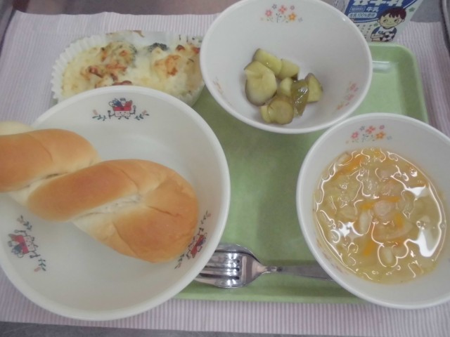 14日 ミルクパン 白身魚とポテトのグラタン ジュリエンヌスープ フレンチきゅうり 牛乳
