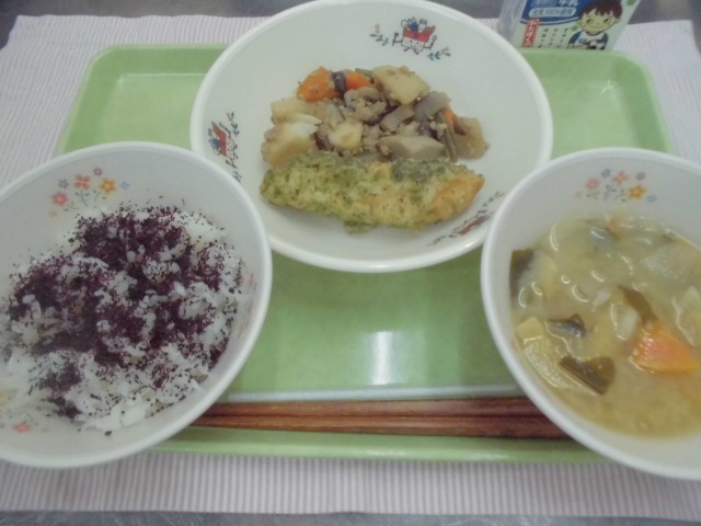 15日 ゆかりごはん ささかまの磯辺揚げ 大根のみそ汁 さといものうま煮 牛乳