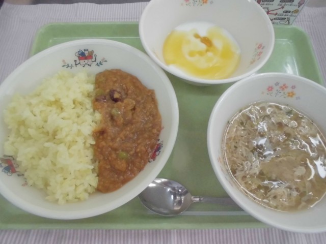 29日 ドライカレー レタスと卵のスープ ヨーグルトのパッションフルーツソースがけ 牛乳