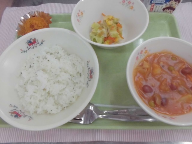 31日 ガーリックライス ビーンズトマトシチュー オニオンドレッシングサラダ スイートパンプキン 牛乳
