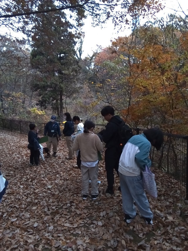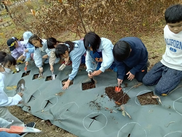 4年生は小山内裏公園のレンジャーの皆さんにご指導いただきながら、里山の自然環境、先人の知恵について学んでいます。今日は公園内の雑木林でドングリや苗木を探し、ナラ枯れの被害の大きいエリアの保全のために苗木を育て、植樹する、という取組を行いました。本校のかなり昔、30年ほど前にも取り組んでいた記録のある特色ある内容です。クヌギやコナラの見分け方、発芽や成長の条件等について教えていただき、落ち葉の中からドングリや若い苗木を見つけ、バケツの水に浸して沈むドングリだけを選び、育苗ポッドに植え込みました。また、ある程度育った苗木は公園内の畑に植える活動も行いました。育苗ポッドは学校でこのあと育てていきます。