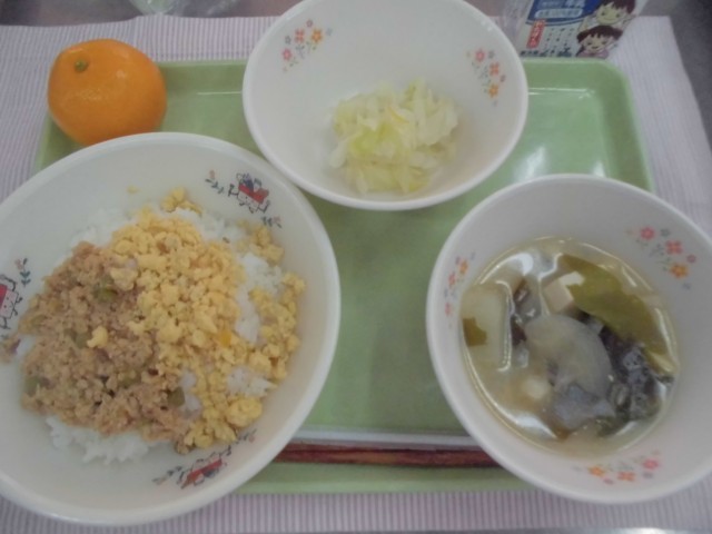 28日 二色丼 じゃがいものみそ汁 八王子産ゆず風味の浅漬け 果物 牛乳