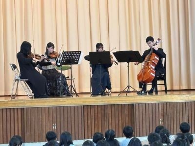 全校児童が参加し、学校運営協議会の皆様、保護者の皆様を招いた音楽鑑賞教室を実施しました。八王子学園都市文化ふれあい財団の主催する「いちょうホール発!ラ♪ラ♪ラ♪コンサート」として、第一線で活躍する若手の演奏家の皆様に来ていただき、弦楽四重奏の演奏を堪能させていただきました。ヴァイオリンの井川璃理さん、大槻茉莉子さん、ヴィオラの渡部雅子さん、チェロの西田歩夢さんの4人の演奏家によるスペシャルメドレーに子供たちは心をたくさん揺さぶられました。楽器の紹介やパートごとの聴き分けクイズ、ピチカート奏法による楽曲、アニメやクリスマスでおなじみの曲など、楽しく参加型の45分間はあっという間に過ぎていきました。ハイライトは校歌を演奏してくださり子ども達みんなで歌ったところ。子ども達の誇らしげな表情も印象的でした。演奏してくださった皆様、楽しい時間をありがとうございました。これからの益々のご活躍を願っております。
