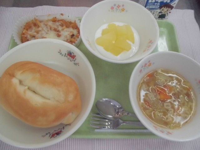 18日 国産小麦パン ポテトのミート焼き ABCスープ りんごヨーグルト 牛乳