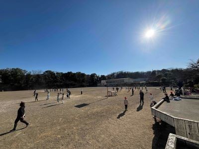 3学期始めの「外遊びタイム」がありました。いつもより少し長めの昼休み。子どもも、そして大人も校庭で元気に過ごします。南風が強いものの、暖かな日差しの中で、学年入り乱れて皆元気に過ごしています。「焼き鳥作ったよ!」というので見てみると、枝に刺した丸めた葉っぱ。「1年生しか入れない秘密基地」というので見てみると、テラスの下の狭い場所に潜り込んで目を輝かせる。ビニール袋に落ち葉と水を入れて日陰においてあるのは、きっと素敵な氷のオブジェを作ろうとしているんですね。子ども達の遊びは子どもたち自身に任せるからこそ、無尽蔵なアイデアが生まれます。