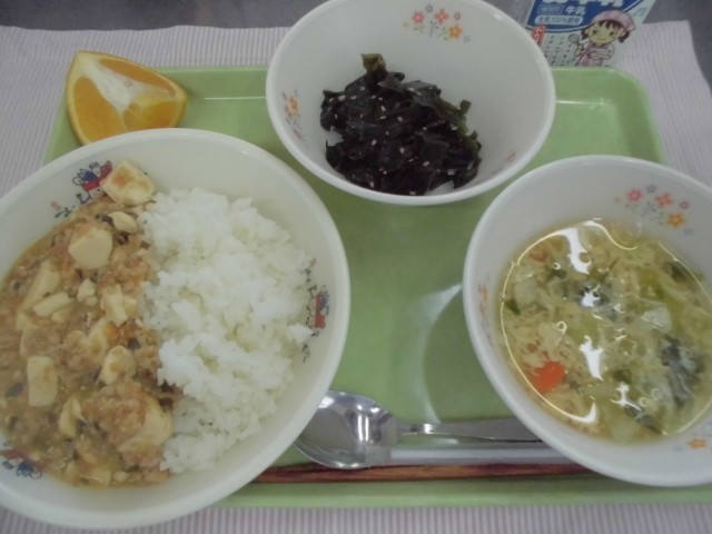 13日 ごはん マーボー豆腐 青梗菜と卵のスープ わかめのにんにく炒め 果物 牛乳