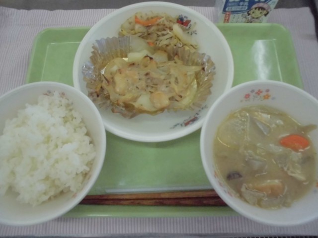 14日 ごはん とりのホイル焼き ごまじゃこ和え 田舎汁 牛乳