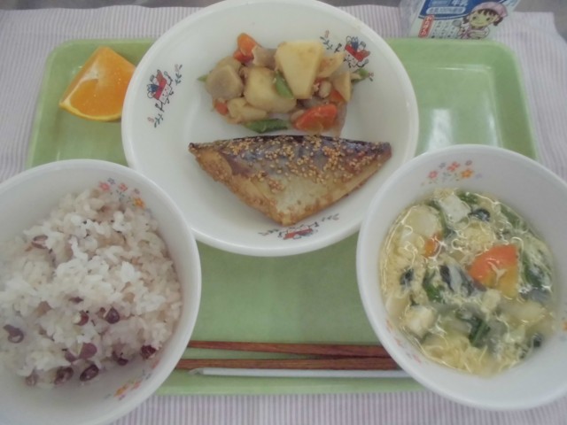 15日 あずきごはん さばのごまみそ焼き いりどり かきたま汁 果物 牛乳