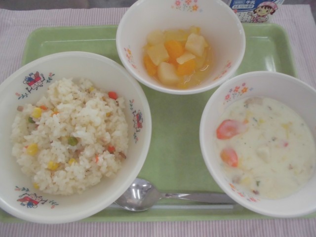 22日 コーンピラフ 八王子産白菜のクリームシチュー ゆず蜜フルーツ 牛乳