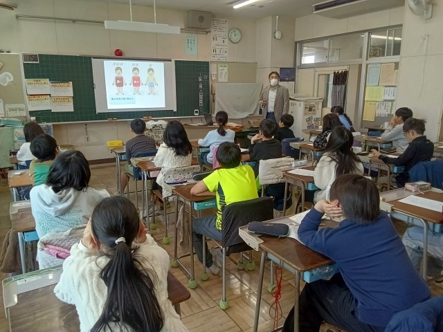 5年生は薬剤師の先生に薬の正しい飲み方について教えていただきました。身近にある薬も飲み方を間違えると効果を発揮できないばかりか、血中の濃度が急に高まると副作用によって害が出てしまうこともある。決まった量を水で飲むことの大切さについて、スライドを見ながらしっかり学ぶことができました。用法用量を守って、ということの大切さを改めて認識しました。ぜひご家庭でも話題にしてみてください。