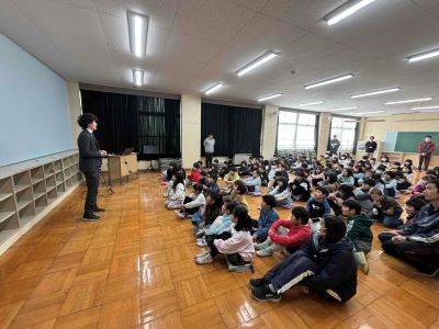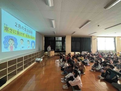 2月に入りました。今朝の朝会は盛りだくさん。生活指導朝会として2月の生活目標「寒さに負けず元気に遊びましょう」が伝えられた後、3年1組に新しく入られる先生の紹介、そして今週1週間予定しているEnglish weekのためにやってきたジョージ先生の自己紹介がありました。週明けにも関わらず盛りだくさんの朝会に子ども達のテンションも上がってみんな笑顔になりました。寒さに負けず、新しい先生とも親しくなって、英語にもたくさん触れて…充実の一週間にしていきましょう。