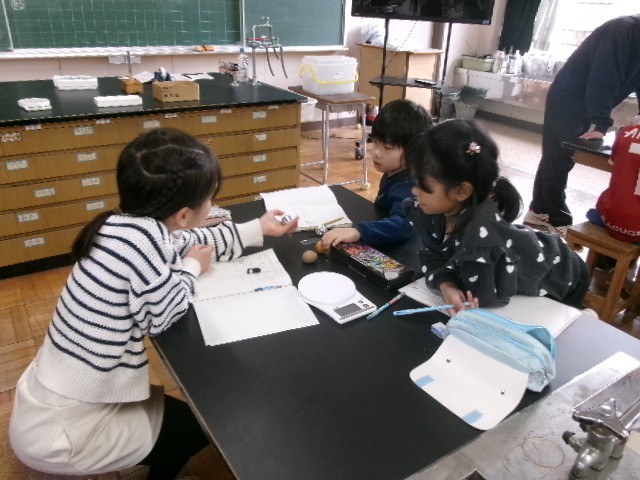 今日の3年生の理科の授業は、ものと重さについてです。同じ体積のちがうものを二つ並べて、重さにちがいがあることを調べます。推測し、班で話し合って、答えを探していきます。3学期になって少し表情も変わってきた3年生の授業の様子でした。