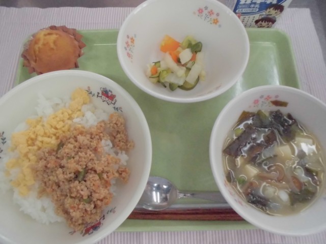 3月6日 二色丼 なめこのみそ汁 浅漬け 干し芋のカップケーキ 牛乳