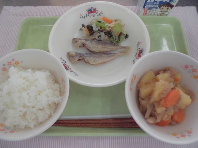 3月9日 ごはん 豆あじの唐揚げ 韓国風肉じゃが 3色ナムル 牛乳