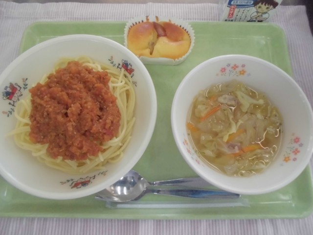 17日 スパゲティミートソース ジュリエンヌスープ ヨーグルトポムポム 牛乳