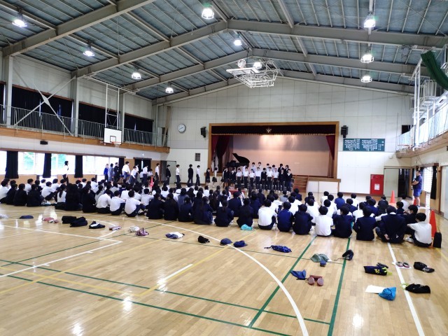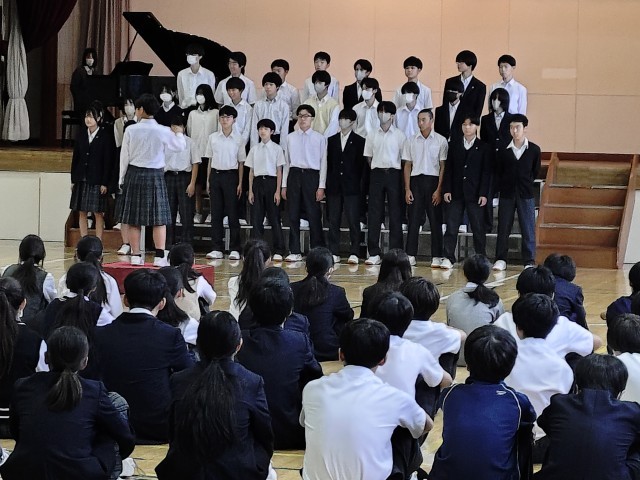 10月7日(火)6校時は、合唱祭に向けての全体練習を実施しました。アナウンスを含めた入場、退場、着席などの流れの確認や鑑賞時のマナーも全校で確認することができました。実行委員が主体となって進行し、まずは3年生がお手本を示してくれたことで、本番当日を意識した、よい緊張感の中で取り組むことができました。