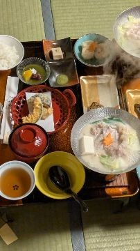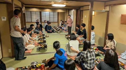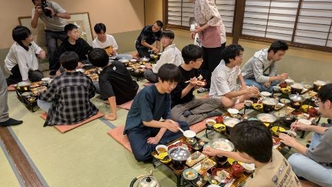 京の宿北海館『お花坊』での夕食の様子です。新米のご飯ということで、皆んな何杯もおかわりをしてました。