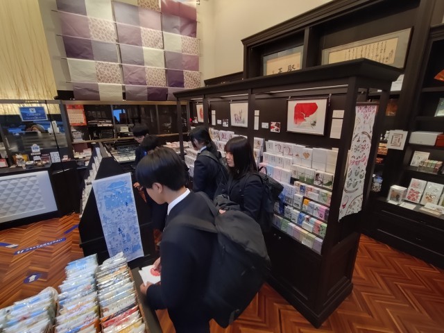 午前中の老舗訪問では、生徒が事前に考えた質問を中心に丁寧に回答していただきました。生徒たちが熱心にお話に対して耳を傾け、メモを必死で取りながら学び取ろうとするステキな場面に出会う事ができました。