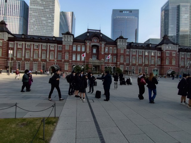 東京駅をバックに班ごとに記念撮影です。企業訪問を終えて、東京駅撮影場所に集まる事ができています。