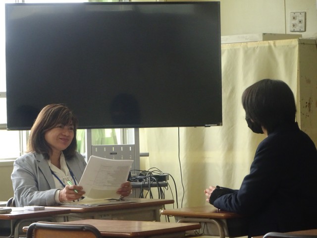 2学年の英語の授業では、ALTの先生との1対1の英会話がありました。